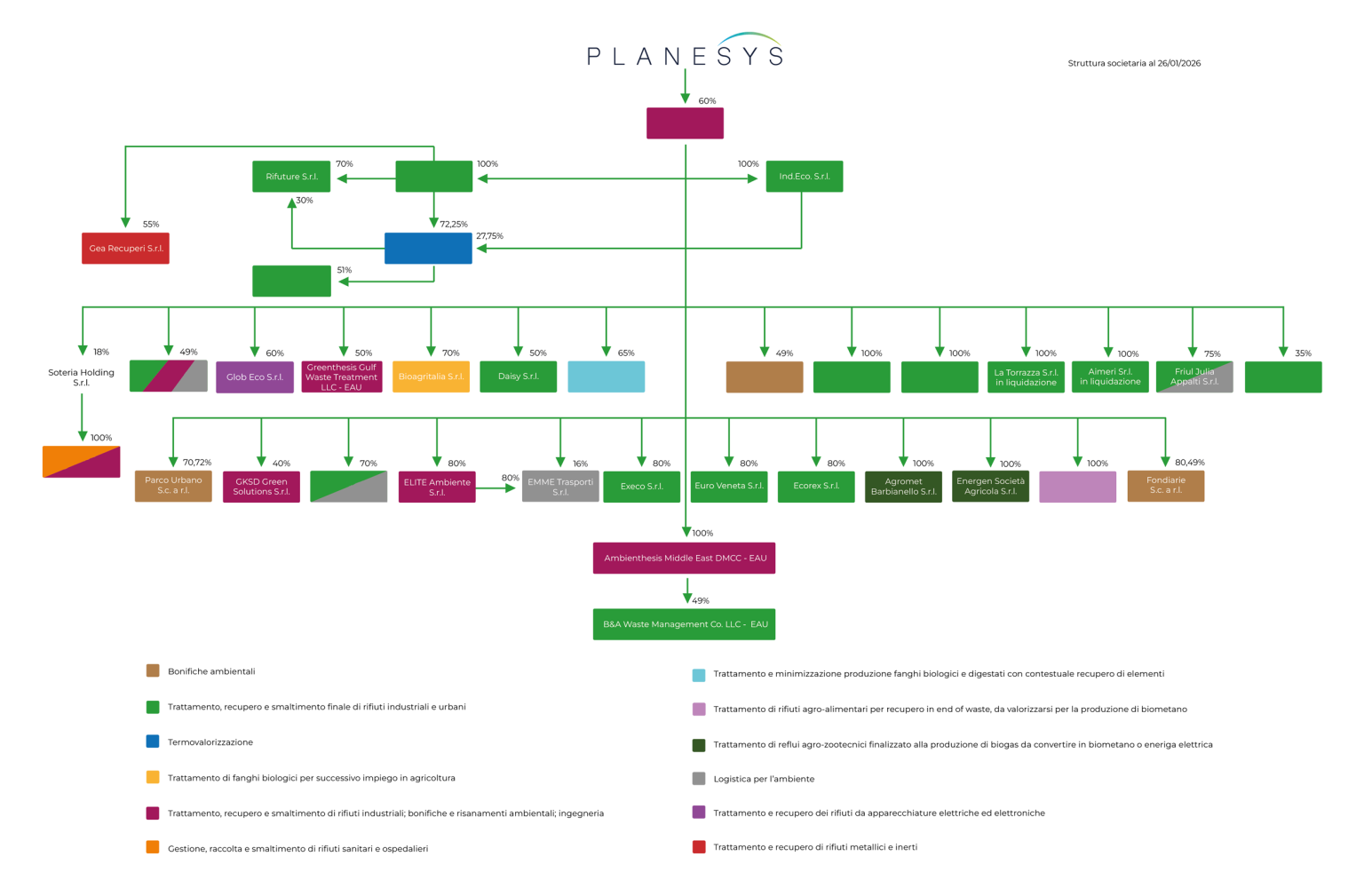 Greenthesis S.p.A. è la società posta a capo dell’omonimo Gruppo il cui schema di sintesi riprodotto qui a fianco riporta le partecipazioni più significative al 26/01/2026 .